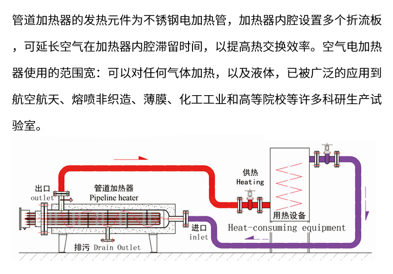 6、管道加热器空气洁净,体积小。