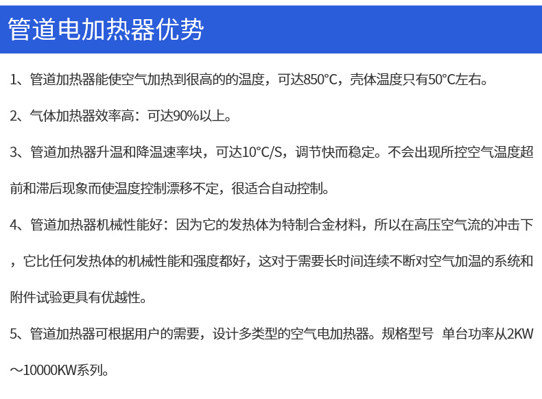 7、管道加热器可根据用户的需要,设计多类型的空气电加热器。规格型号 单台功率从2KW~10000KW系列。